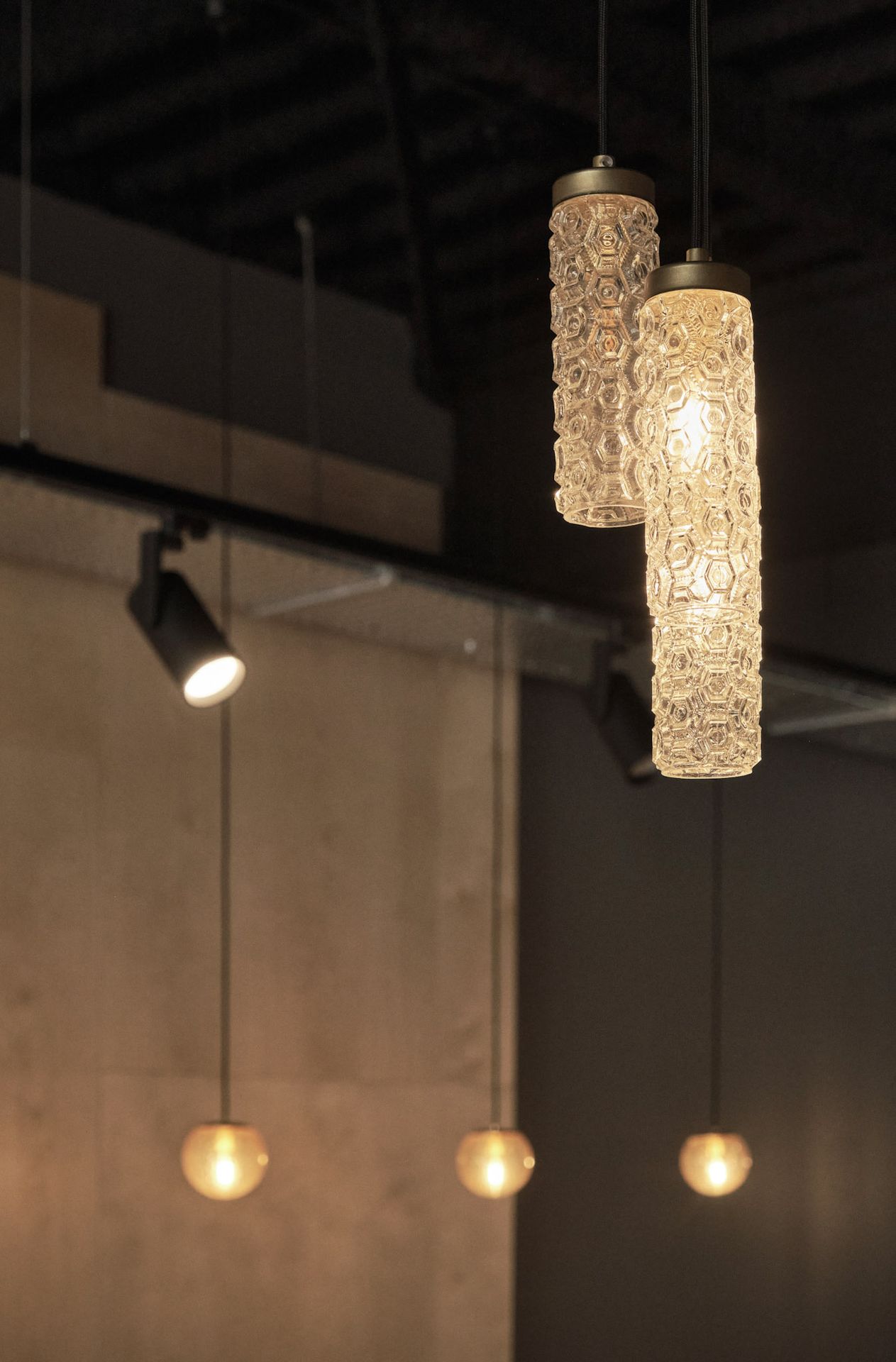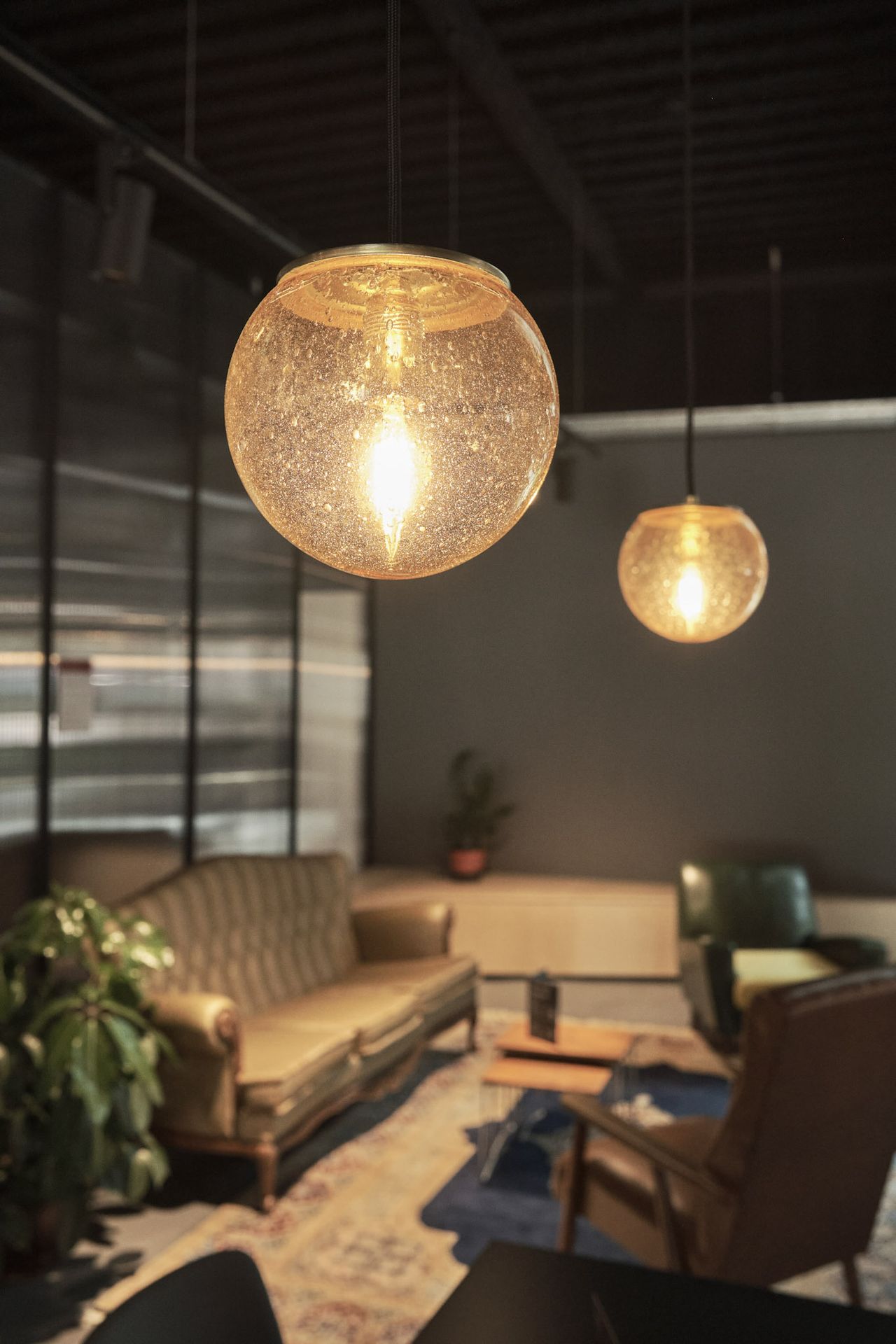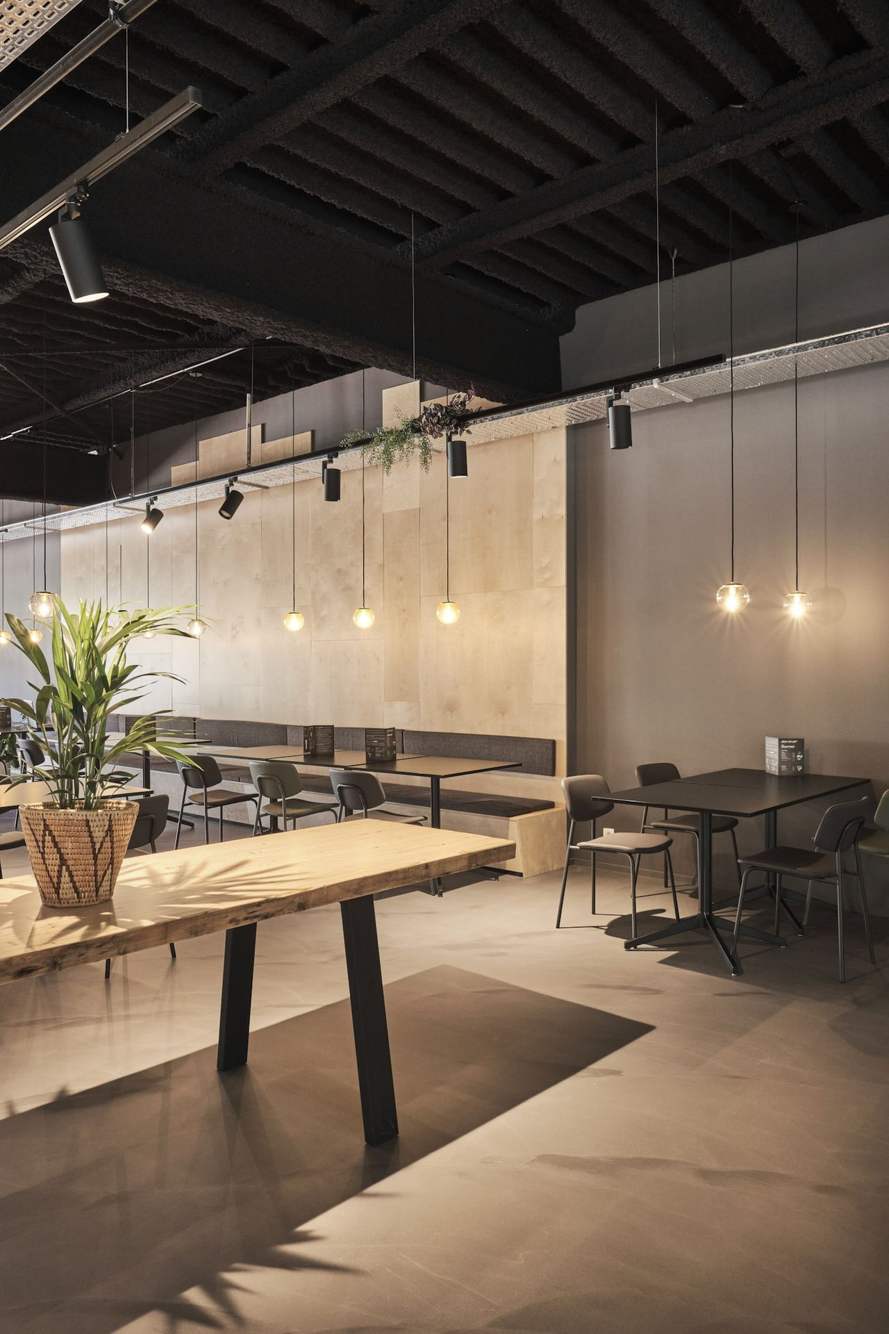The design incorporates a lot of reclaimed materials. Notice for instance our Sybile hanging lights among other reclaimed fixtures, and the large tables made from salvaged gluelam beams.