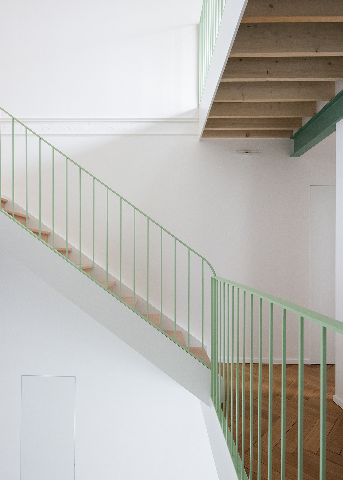 On the street side, the rooms are perfectly restored in their original state, by the conservation of their volume and the rehabilitation of their decoration. The central parts are dematerialized and transformed into a large staircase. This intervention is inspired by Belgian architect Victor Horta, which, a century ago, upsets the plan of the typical Brussels house by implanting the staircase in the centre of the house, source of light and visual connection. The stairs are connected to large landing like mezzanine, allowing to receive other activities than only traffic, transforming this space into a living area.