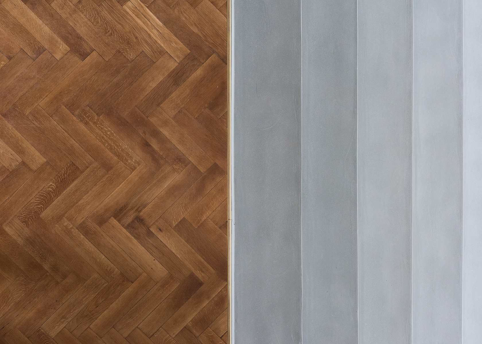 Applied materials : Lighting tracks, hanging lights, oak flooring, hardware
