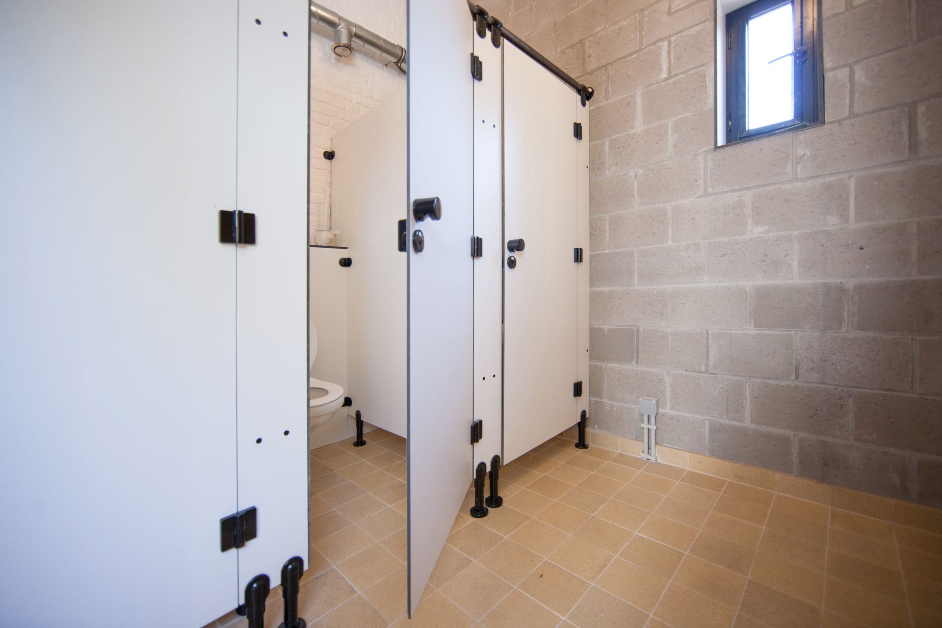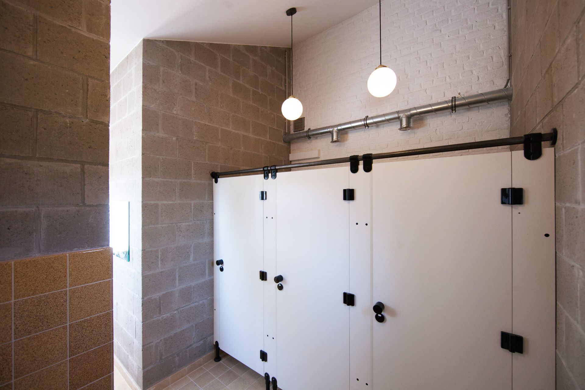 The interior of the sanitary block is mainly made of reuse materials sold by RotorDC. Ceramic tiles, which were once used as tiles in the former Everheide Primary School in Evere (1930s), have a second life. Sanitary appliances (urinals, toilets and hanging sinks), lighting and mirrors were also recovered elsewhere, before finding their new destination here.