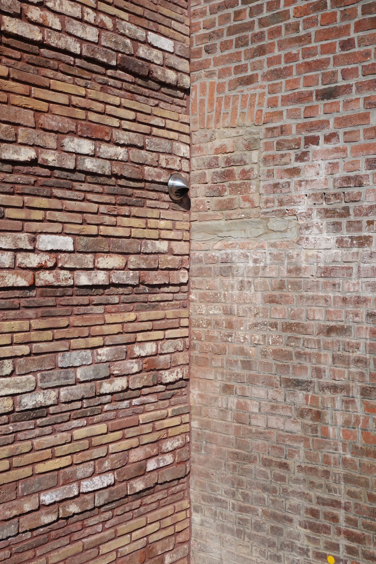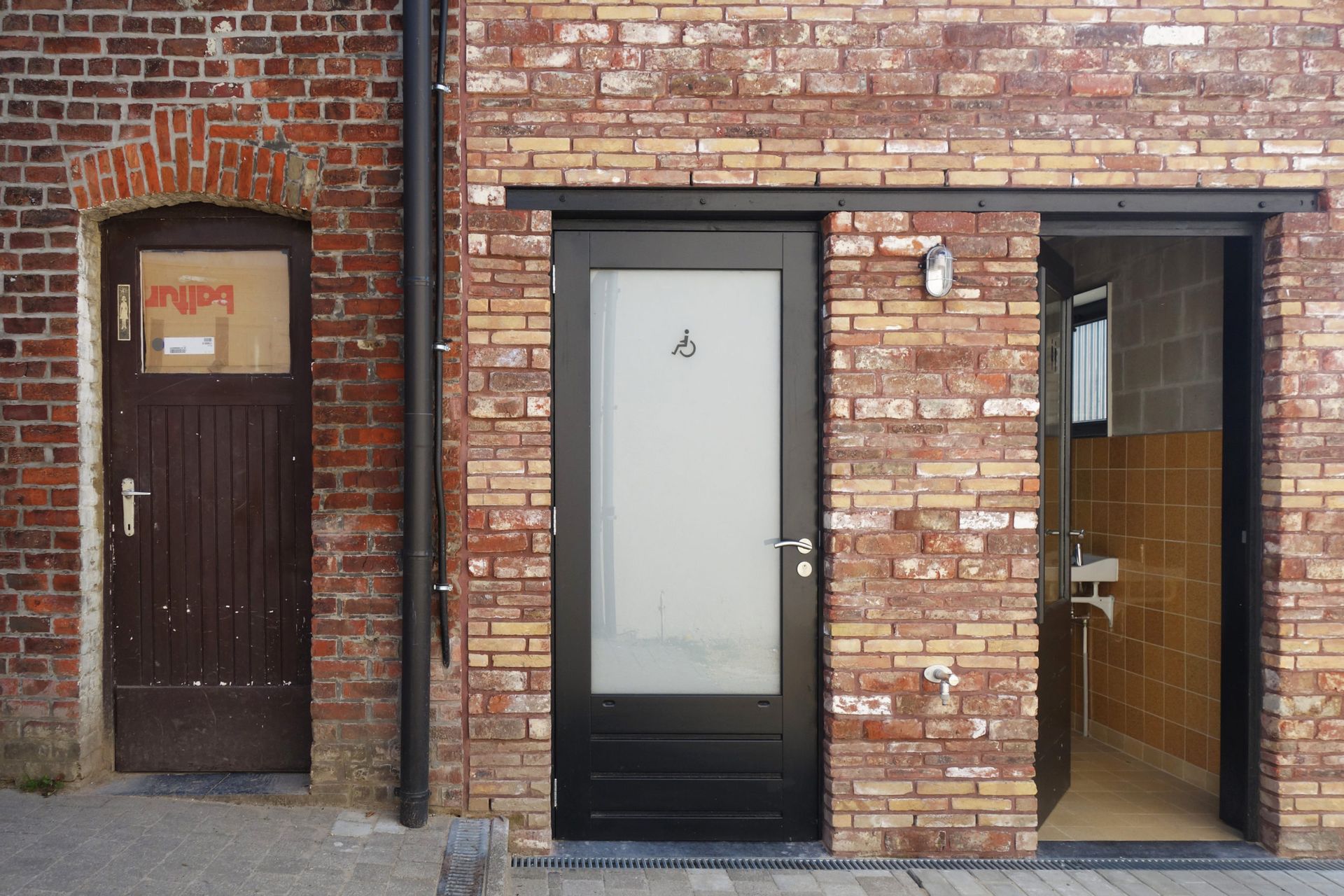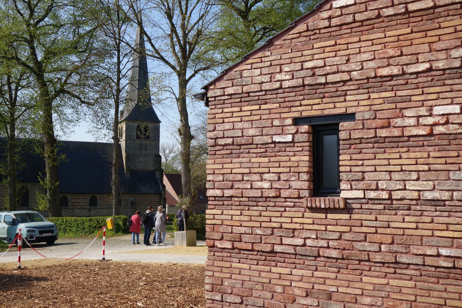 The facade, for example, is entirely made of reusable bricks. Two types of bricks were laid: a yellowish industrial brick and a rougher country oven brick, of which a classic and a thinner version were used. By alternating the type of brick every three horizontal lines, a layered composition is created. Thus, the old salvaged brick ensures the integration of the new building into the existing brick wall of the old farm, while retaining its individuality thanks to atypical masonry equipment. The layered construction is an allusion to the masonry (sand-lime stone and successive layered brick) of the Sainte-Anne-Pede chapel on the neighbouring site.