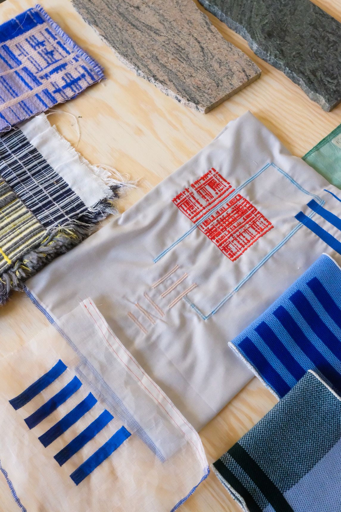 Dining connects. Table Talk is inspired by the classic bistro table: a small, round table where all kinds of conversations can take place. The design is made from leftover marble (Rotor DC) with a colored metal ring, between which a tablecloth is stretched. The tablecloth is made from leftover textiles (Kvadrat) and embroidered with various shapes, creating a visual dialogue. The result is an object with a unique and playful composition, shaped by the available waste streams.