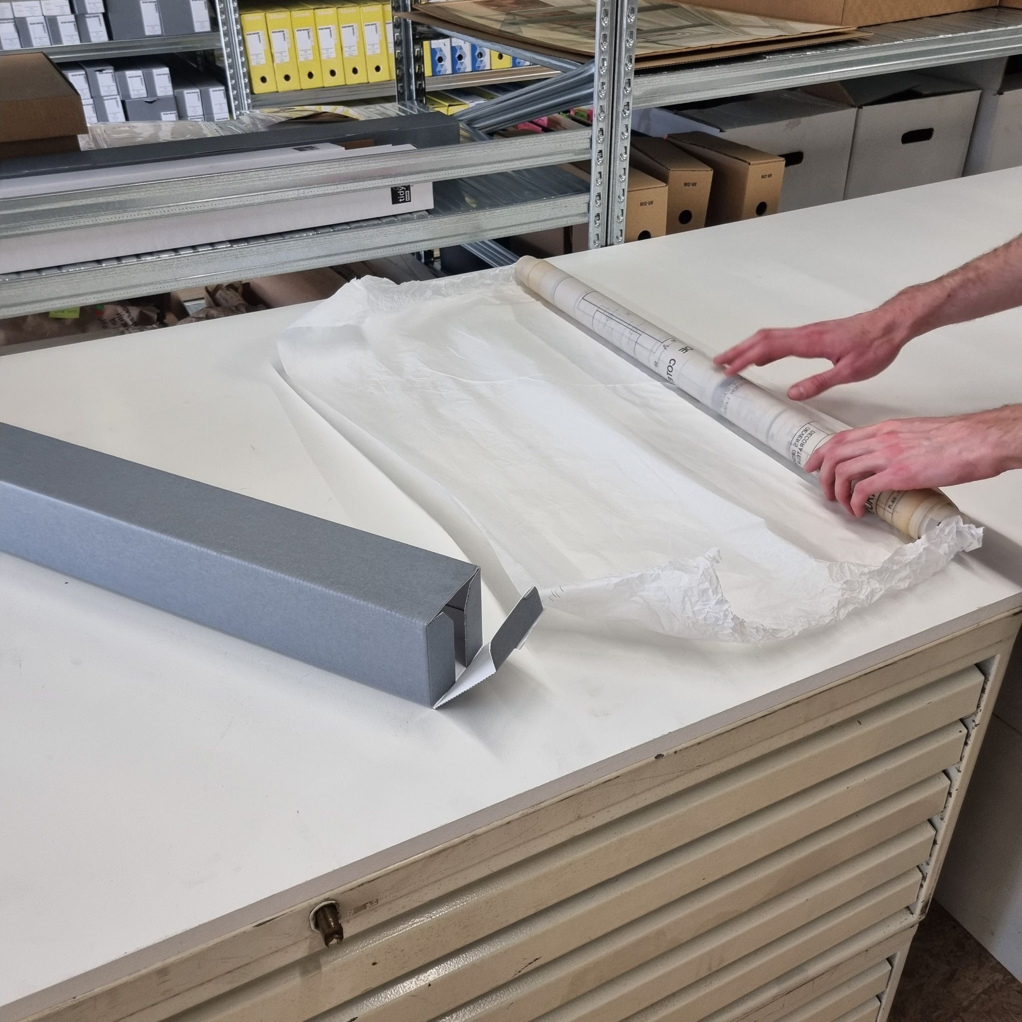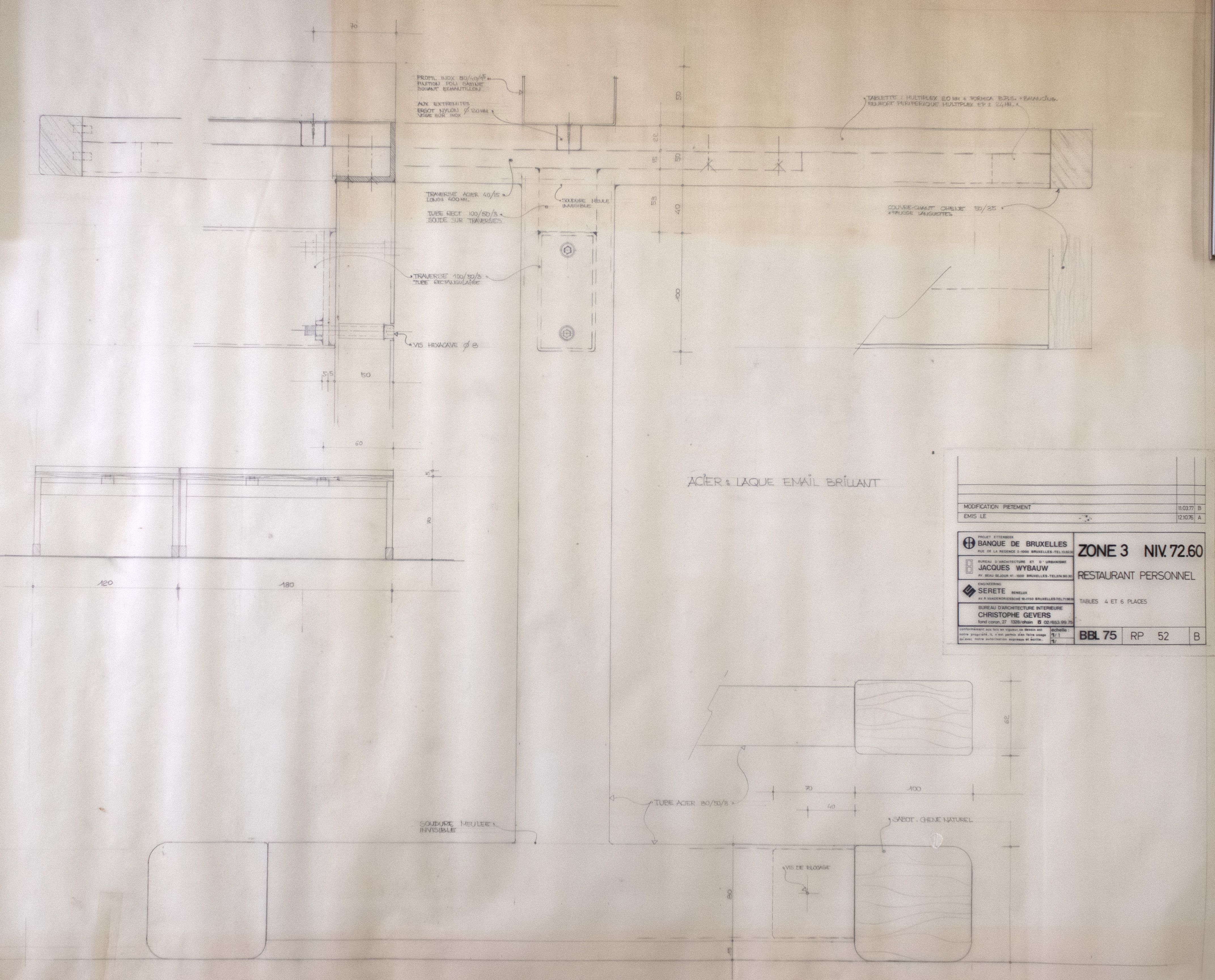 We had the privilege of recovering the tables from the cafeteria of the former headquarters of the 'Banque Bruxelles Lambert' in Etterbeek (Brussels). This cafeteria was designed by Christophe Gevers between 1975 and 1976. It is one of the designer's most important commissions in the 1970s, after the interior design of 'Passage 44' and just before his work for the Générale de Banque headquarters (from which we salvaged strikingly similar tables 10 years ago!). We visited the archives of Christophe Gevers, hosted by the Design Museum Brussels. Our aim? To find all the information we could about the former cafeteria of the Banque Bruxelles Lambert headquarters in Etterbeek. After unpacking several rolls of plans, technical details, sketches and many other wonders, we found it: the 1975 drawing of the exact tables we had recovered, with their distinctive details in solid oak!