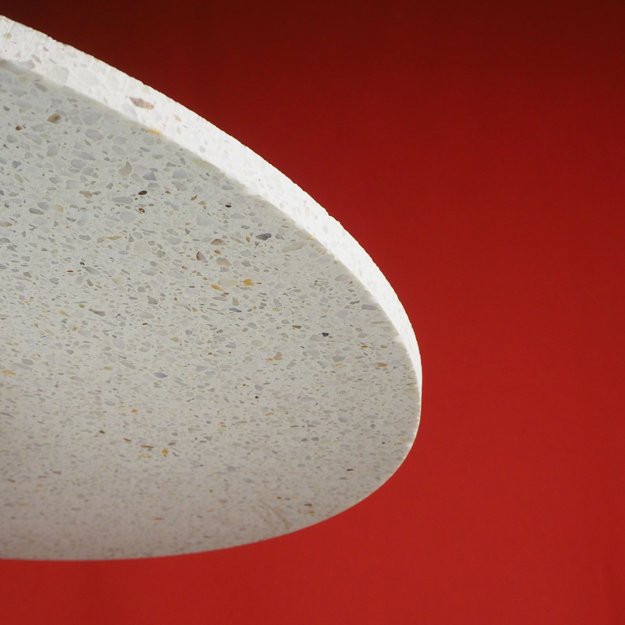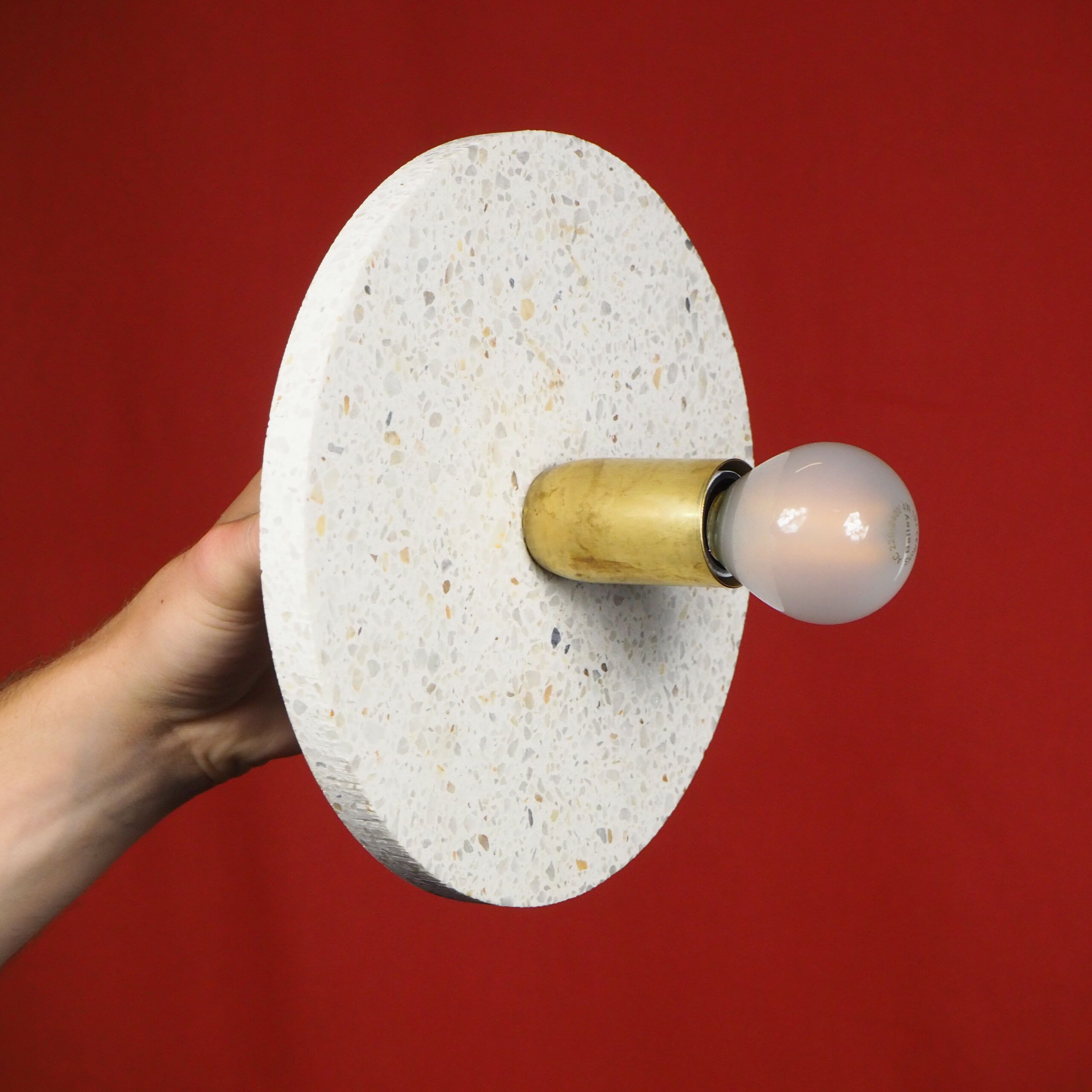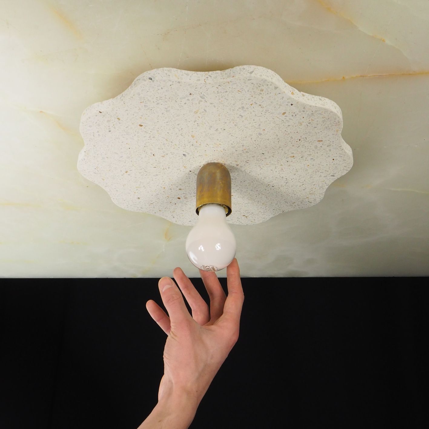 New in our shop! Hanging light ‘Aurore’ in white terrazzo with brass fittings, home made in our own light workshop.