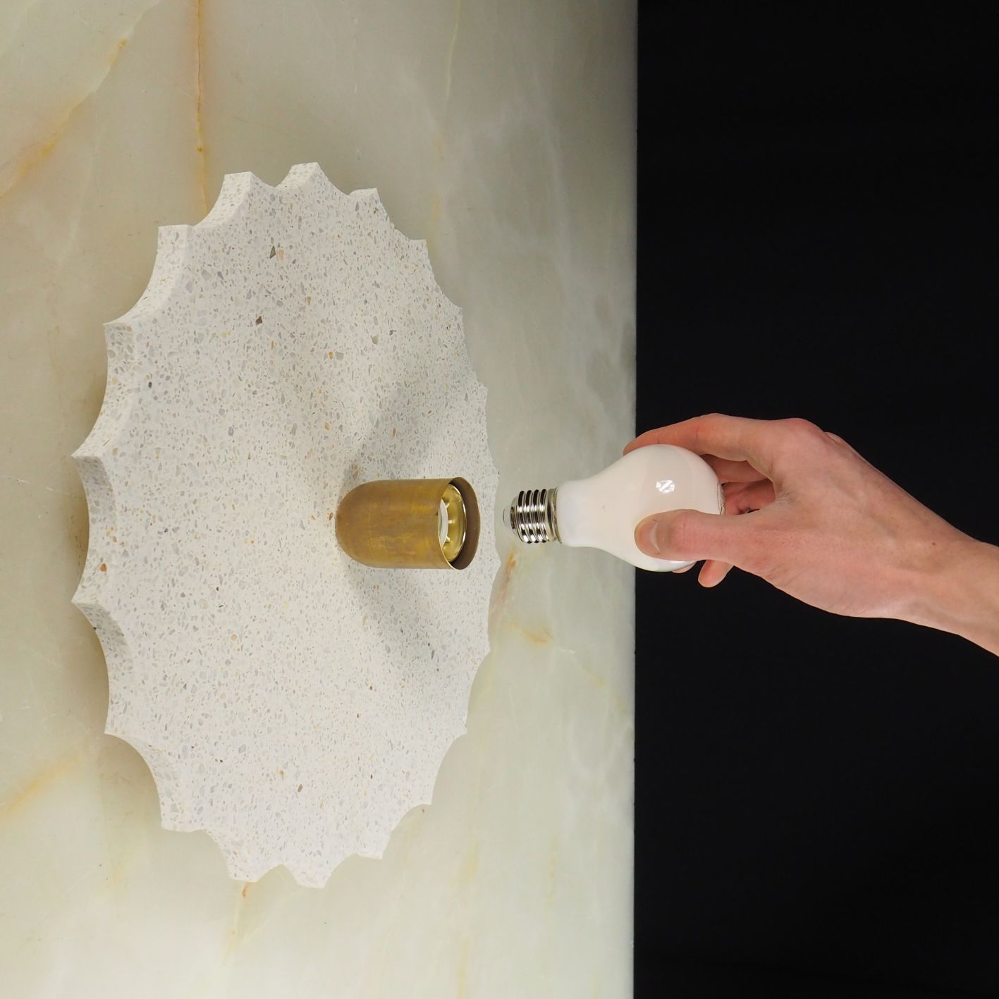When we dismantle tiles and natural stone we often have damaged pieces that are hard to find a use for. This series of wall lights, ceiling lights and hanging lights ‘Aurore’ makes clever use of these smaller pieces. First step is to cut the damaged tiles to homogenous circles using a CNC water jet.