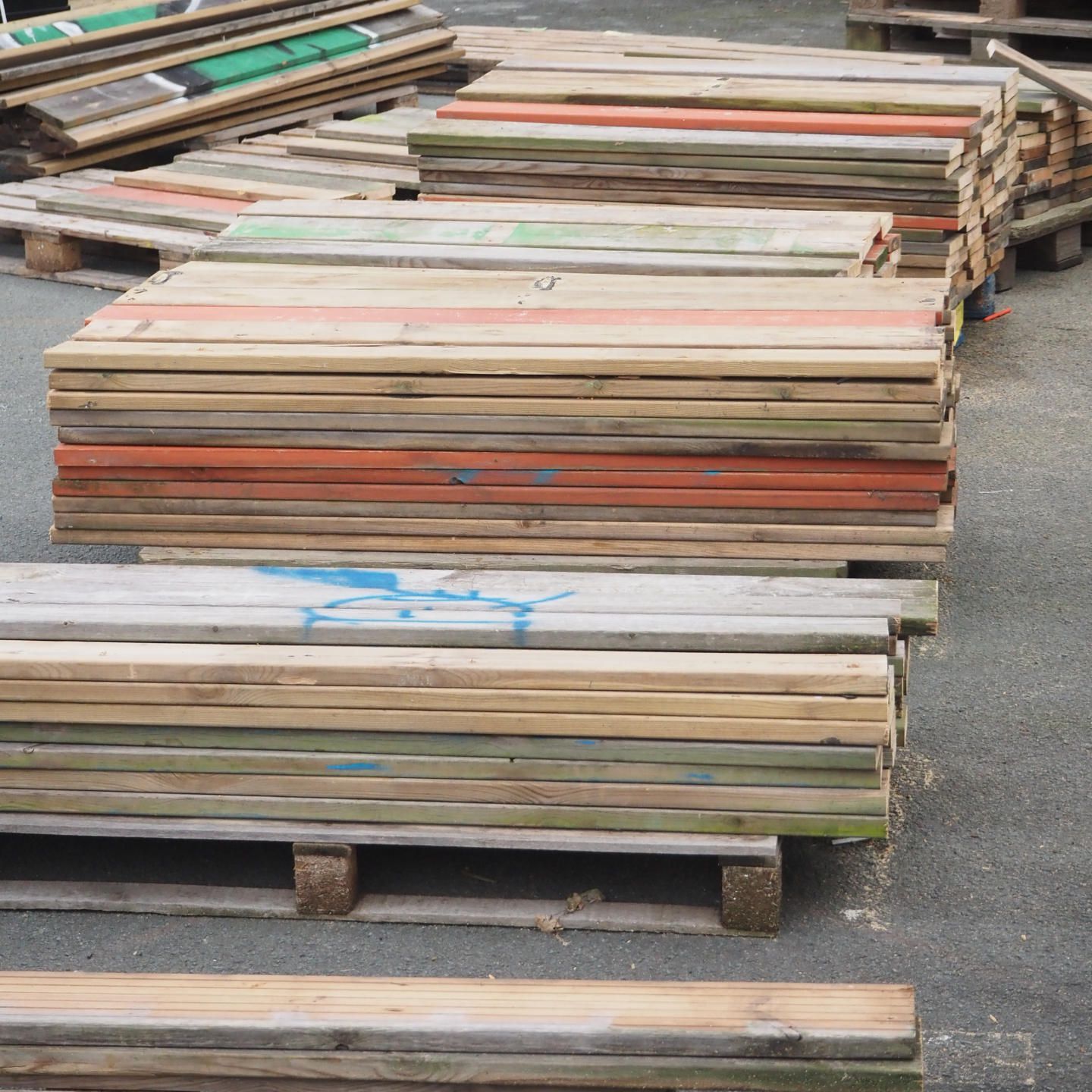 After 15 years of use, the original wooden cladding showed some local damage that made maintenance of the playground too costly, so the administration decided to replace about 1000 m² of cladding with new wood. Although this type of damage was present on many pieces of wood, it usually affected less than 10% of the length of each board. So, after dismantling, we cut the damaged parts, removed the nails and recovered a unique material ready for a new use. This is child's play!