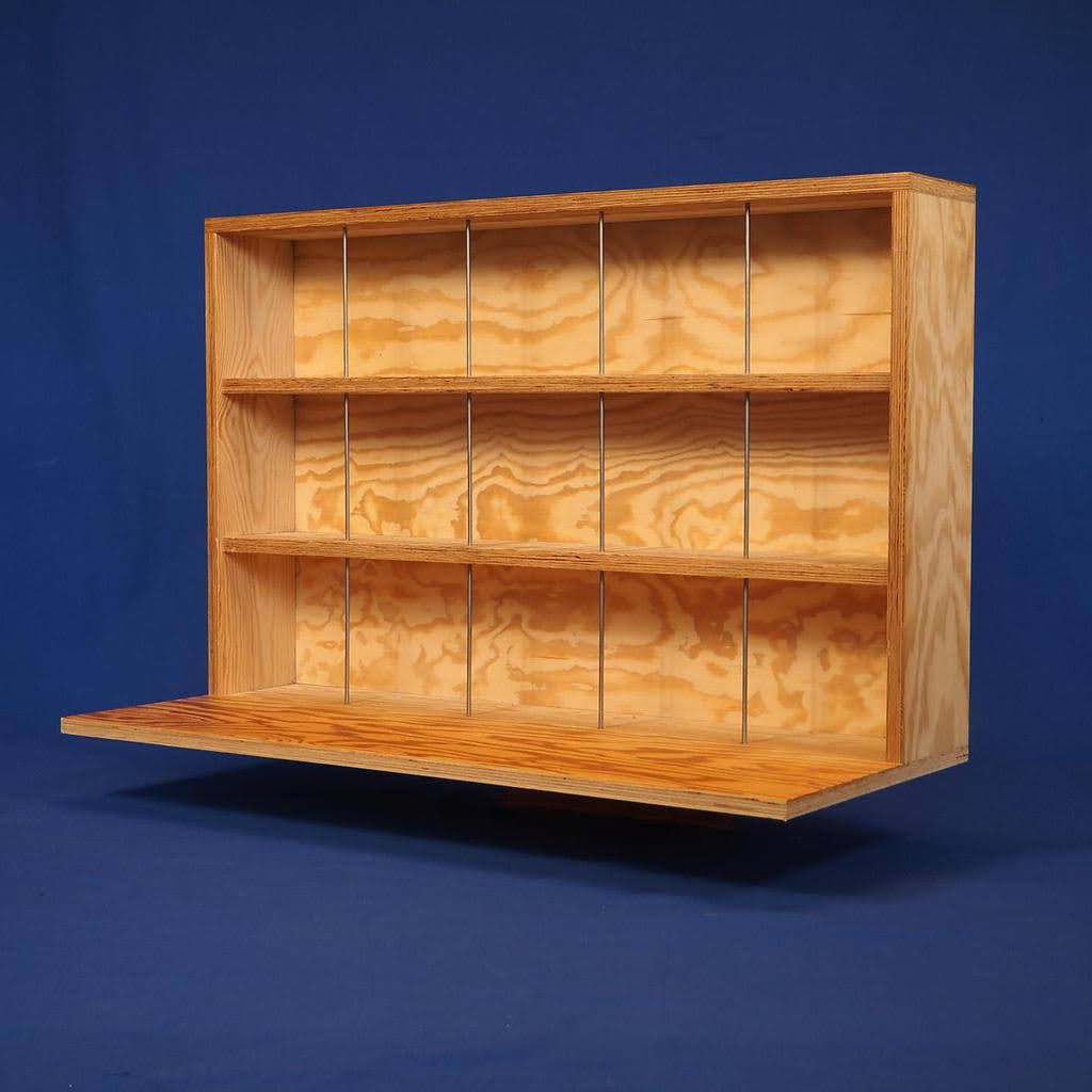 Well, the 88 custom-made plywood displays from the former PointCulture media library of the ULB campus. The latter had to close its doors and pass the torch to other existing libraries. These plywood stands were originally created to display vinyl records at the "Point Culture" media library at ULB. We still have dozens of them, and the first ones placed with clients are showing just how adaptable they can be. No need for heavy processing to transform these objects into new products: a simple 90° rotation and there you have your new wall display cabinet!