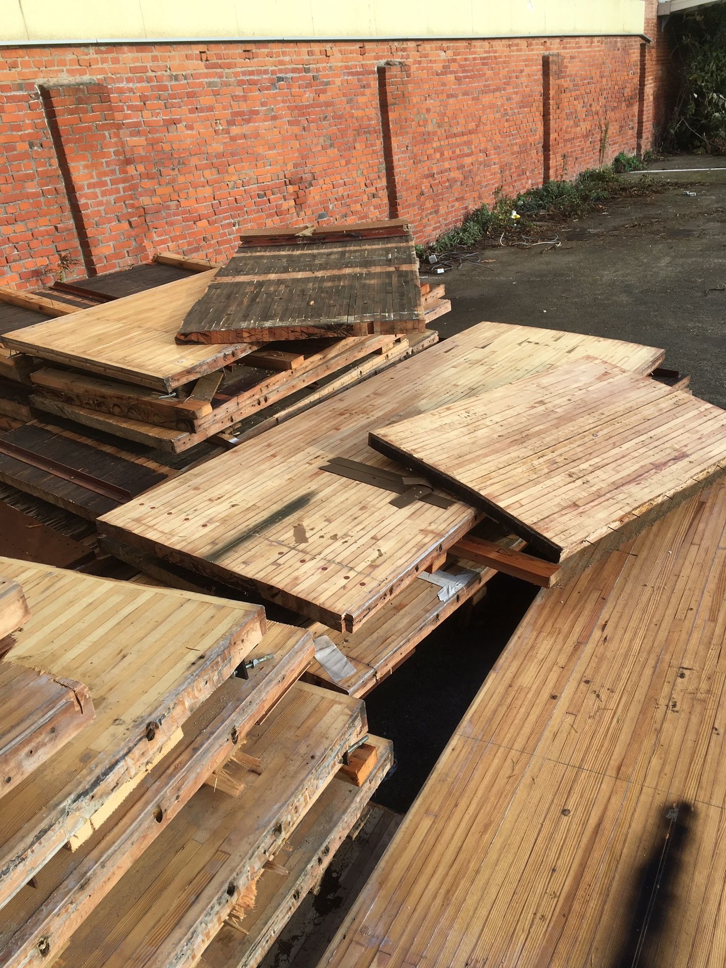 Over the past few weeks, in collaboration with demolition contractor BSV, we have organised the extraction of the wooden bowling alleys on the Meibloem site in Ghent. The long slabs have arrived at our warehouse and will be cut in the coming days. They will be cut in sections of 2, 3, and 4 meters. Longer lengths are however still possible on demand, up to 9 meter! The slabs will be sold unprocessed, without further denailing or sanding. Perhaps at a later stage we will make some tables from a few of them. The alleys are composed of a mixture of primarily pine wood, with beech and details in maple and wengé. Surfaces should be expected to have scratches and water damage. Presumably they will have to be sanded before usage.