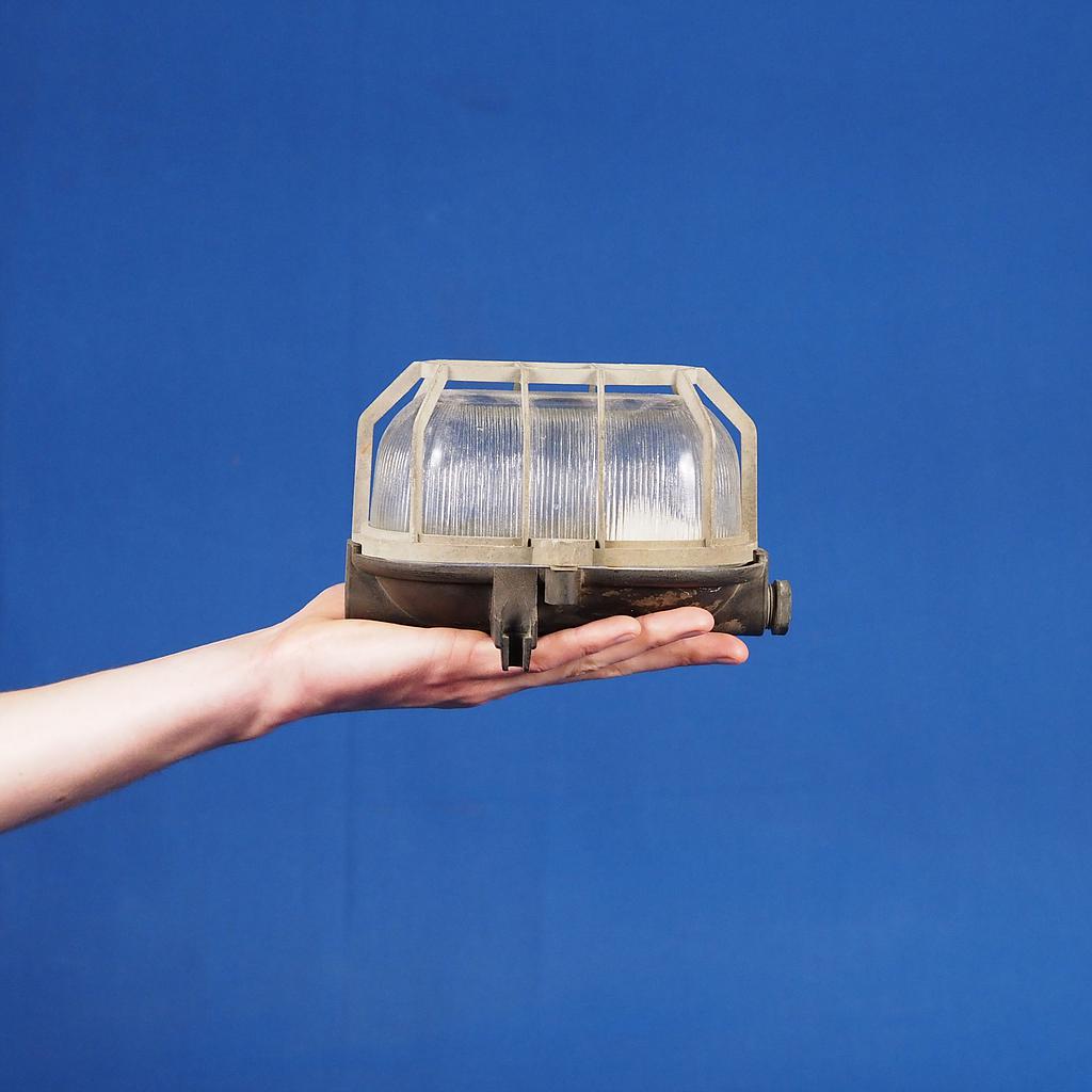 Caged wall/ceiling light with bakelite base and textured glass diffuser by Hublot (E27)